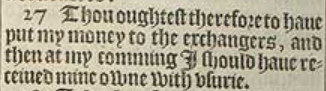 27 Thou oughtest therefore to haue put my money to the exchangers, and then at my comming I should haue receiued mine owne with vsurie.