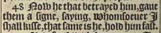 48 Now he that betrayed him, gaue them a signe, saying, Whomsoeuer I shall kisse, that same is he, hold him fast.