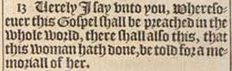 13 Uerely I say vnto you, Wheresoeuer this Gospel shall be preached in the whole world, there shall also this, that this woman hath done, be told for a memoriall of her.