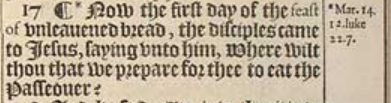 17 ¶ *Now the first day of the feast of vnleauened bread, the disciples came to Iesus, saying vnto him, Where wilt thou that we prepare for thee to eat the Passeouer?[*Mar. 14.12. luke 22.7.]