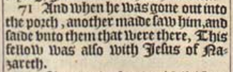 71 And when he was gone out into the porch, another maide saw him, and saide vnto them that were there, This fellow was also with Iesus of Nazareth.