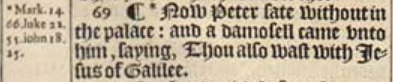 69 ¶ *Now Peter sate without in the palace: and a damosell came vnto him, saying, Thou also wast with Iesus of Galilee.[*Mark. 14.66. luke 22.55. iohn 18.25.]