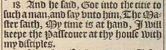 18 And he said, Goe into the citie to such a man, and say vnto him, The Master saith, My time is at hand, I will keepe the Passeouer at thy house with my disciples.