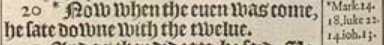 20 *Now when the euen was come, he sate downe with the twelue.[*Mark 14.18. luke 22.14. ioh. 13.21.]