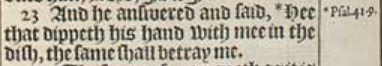 23 And he answered and said, *Hee that dippeth his hand with mee in the dish, the same shall betray me.[*Psal. 41.9.]