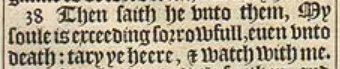 38 Then saith he vnto them, My soule is exceeding sorrowfull, euen vnto death: tary ye heere, & watch with me.