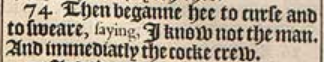 74 Then beganne hee to curse and to sweare, saying, I know not the man. And immediatly the cocke crew.