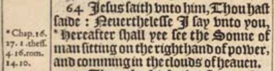 64 Jesus sagte zu ihm "Du hast es gesagt: Nichtdestotrotz sage ich zu dir *'Hiernach werdet ihr den Sohn des Menschen an der rechten Hand der Macht sitzen sehen und in die Wolken des Himmels kommen.'"[*Matthäus 16:27 1. Thessalonicher 4:16 Römer 14:10]