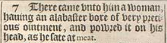 7 There came vnto him a woman, hauing an alabaster boxe of very precious ointment, and powred it on his head, as he sate at meat.