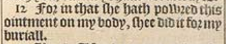 12 For in that she hath powred this ointment on my body, shee did it for my buriall.