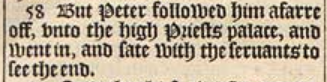 58 But Peter followed him afarre off, vnto the high Priests palace, and went in, and sate with the seruants to see the end.