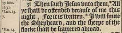 31 Then saith Iesus vnto them, *All ye shall be offended because of me this night, For it is written, *I will smite the Shepheard, and the sheepe of the flocke shall be scattered abroad.[*Marke 14.27. iohn. 16.32. , * Zach. 13.7.]