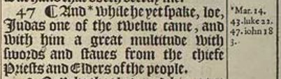47 ¶ And *while he yet spake, loe, Iudas one of the twelue came, and with him a great multitude with swords and staues from the chiefe Priests and Elders of the people.[*Mar. 14.43. luke 22.47. iohn 18.3.]