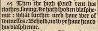 65 Then the high Priest rent his clothes, saying, He hath spoken blasphemie: what further need haue wee of witnesses? Behold, now ye haue heard his blasphemie.