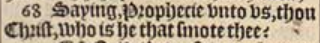 68 Saying, Prophecie vnto vs, thou Christ, who is he that smote thee?
