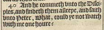 40 And he commeth vnto the Disciples, and findeth them asleepe, and saith vnto Peter, What, could ye not watch with me one houre?