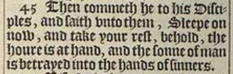 45 Then commeth he to his Disciples, and saith vnto them, Sleepe on now, and take your rest, behold, the houre is at hand, and the sonne of man is betrayed into the hands of sinners.