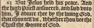 63 But Iesus held his peace. And the high Priest answered, and said vnto him, I adiure thee by the liuing God, that thou tell vs, whether thou bee the Christ the Sonne of God.