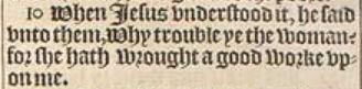 10 When Iesus vnderstood it, he said vnto them, Why trouble ye the woman? for she hath wrought a good worke vpon me.