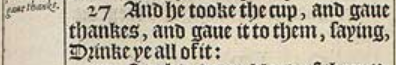 27 And he tooke the cup, and gaue thankes, and gaue it to them, saying, Drinke ye all of it: