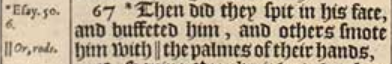 67 *Then did they spit in his face, and buffeted him, and others smote him with || the palmes of their hands,[*Esay. 50.6. , || Or, rods.]
