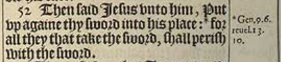 52 Then said Iesus vnto him, Put vp againe thy sword into his place: *for all they that take the sword, shall perish with the sword.[*Gen. 9.6. reuel. 13.10.]