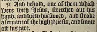 51 And behold, one of them which were with Iesus, stretched out his hand, and drew his sword, and stroke a seruant of the high Priests, and smote off his eare.
