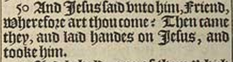 50 And Iesus said vnto him, Friend, Wherefore art thou come? Then came they, and laid handes on Iesus, and tooke him.
