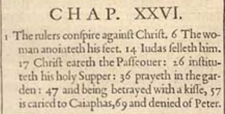 1 Die Herrschenden verschwören sich gegen Christus. 6 Die Frau salbt seine Füße. 14 Judas verkauft ihn. 17 Christus isst dass Passamahl: 26 Führt sein heiliges Mahl ein: 36 Betet im Garten: 47 Und wird mit einem Kuss betrogen, 57 wird nach Kajaphas gebracht, 69 und von Petrus verleugnet.