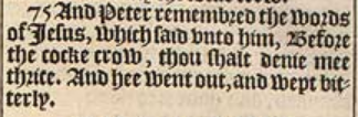 75 And Peter remembred the words of Iesus, which said vnto him, Before the cocke crow, thou shalt denie mee thrice. And hee went out, and wept bitterly.