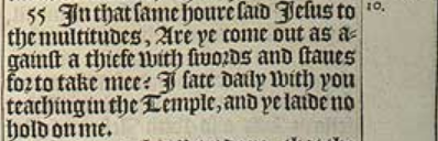 55 In that same houre said Iesus to the multitudes, Are ye come out as against a thiefe with swords and staues for to take mee? I sate daily with you teaching in the Temple, and ye laide no hold on me.