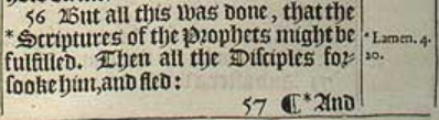 56 But all this was done, that the *Scriptures of the Prophets might be fulfilled. Then all the Disciples forsooke him, and fled:[*Lamen. 4.20.]