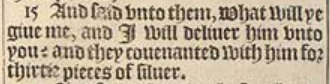 15 And said vnto them, What will ye giue me, and I will deliuer him vnto you? and they couenanted with him for thirtie pieces of siluer.