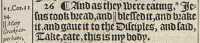 26 ¶ And as they were eating, *Iesus took bread, and || blessed it, and brake it, and gaue it to the Disciples, and said, Take, eate, this is my body.[*Cor. 11.24. , || Many Greeke copies haue, gaue thanks.]