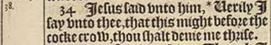 34 Iesus said vnto him, *Uerily I say vnto thee, that this night before the cocke crow, thou shalt denie me thrise.[*Iohn 13.38.]
