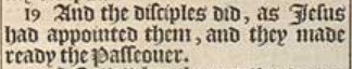 19 And the disciples did, as Iesus had appointed them, and they made ready the Passeouer.
