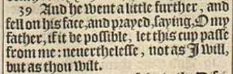 39 And he went a little further, and fell on his face, and prayed, saying, O my father, if it be possible, let this cup passe from me: neuerthelesse, not as I will, but as thou wilt.