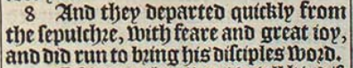 8 And they departed quickly from the sepulchre, with feare and great ioy, and did run to bring his disciples word.