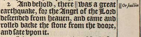 2 And behold, there ||was a great earthquake, for the Angel of the Lord descended from heauen, and came and rolled backe the stone from the doore, and sate vpon it.[||Or, had bin]