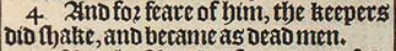 4 And for feare of him, the keepers did shake, and became as dead men.