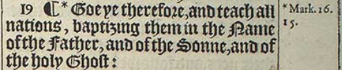 19 ¶*Goe ye therefore, and teach all nations, baptizing them in the Name of the Father, and of the Sonne, and of the holy Ghost:[*Mark.16.15]