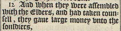 12 And when they were assembled with the Elders, and had taken counsell, they gaue large money vnto the souldiers,