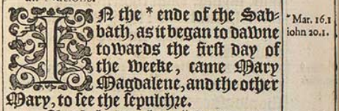 1 In the *ende of the Sabbath, as it began to dawne towards the first day of the weeke, came Mary Magdalene, and the other Mary, to see the sepulchre.[*Mar. 16.1 iohn 20.1.]