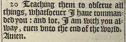 20 Teaching them to obserue all things, whatsoeuer I haue commanded you: and loe, I am with you alway, euen vnto the end of the world. Amen.