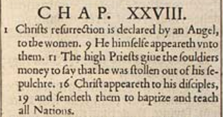 1 Christus' Wiederauferstehung wird den Frauen von einem Engel verkündet. 9 Er selbst erscheint ihnen. 11 Die Hohepriester geben den Soldaten Geld, damit sie sagen, er sei aus der Grabkammer gestohlen worden. 16 Christus erscheint seinen Jüngern 19 und schickt sie, zu taufen und alle Nationen zu lehren.