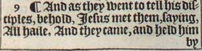 9 ¶ And as they went to tell his disciples, behold, Iesus met them, saying, All haile. And they came, and held him by the feet, and worshipped him.