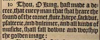 10 Thou, O King, hast made a decree, that euery man that shal heare the sound of the cornet, flute, harpe, sackbut, psalterie, and dulcimer, and all kinds of musicke, shall fall downe and worship the golden image: