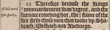 22 Therefore because the Kings +commandement was vrgent, and the furnace exceeding hot, the || flame of the fire slew those men that tooke vp Shadrach, Meshach and Abednego. [ +Cald. word. , || Or, sparke. ]