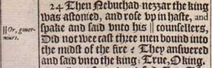24 Then Nebuchad-nezzar the king was astonied, and rose vp in haste, and spake and said vnto his || counsellers, Did not wee cast three men bound into the midst of the fire? They answered and said vnto the king; True, O king. [ || Or, gouernours. ]