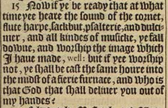15 Now if ye be ready that at what time yee heare the sound of the cornet, flute, harpe, sackbut, psalterie, and dulcimer, and all kindes of musicke, ye fall downe, and worship the image which I haue made, well: but if yee worship not, ye shall be cast the same houre into the midst of a fierie furnace, and who is that God that shall deliuer you out of my handes?